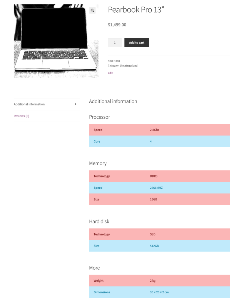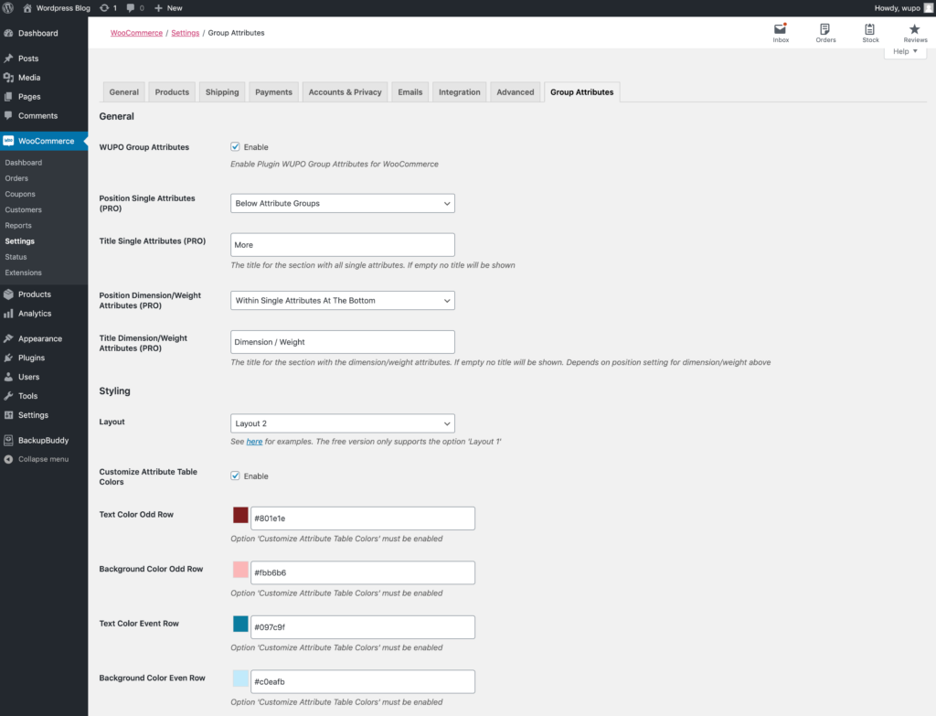 Define colors for customizing the attribute tables with support for odd/even rows. The WooCommerce Group Attributes plugin is able to adapt to your unique page design.